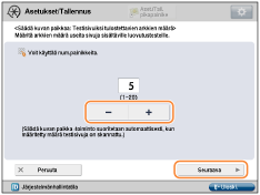 Älä käytä tätä toimintoa paperille, jolle on jo painettu logoja tai kuvioita (esipainettu paperi), tai jos paperiarkit ovat likaisia. Paperisäiliöön on lisättävä tarpeeksi paperiarkkeja säätösivujen tulostamista varten. Jos automaattisen säädön aikana ilmenee paperitukos, säätösivuja ei ehkä tulosteta. |