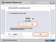 Samodejno prilagajanje ne bo izvedeno za opravila, ki jih sprožite tako, da prekinete opravilo, ki že poteka. Taka opravila se ne morejo začeti v časovnih intervalih prekinitev, ki jih nastavite. Upoštevajte, da je nastavitev intervala zgolj ocena. Funkcija za popravke prekinitev zmanjša nihanja pri opravilih z velikim številom listov. Če želite dati prednost natančnosti s prilagajanjem intervalov prekinitve, povečajte pogostost prekinitev. Vendar pa bo za to potrebno več strani za prilagajanje in bo storilnost zato manjša. Prilagajanje morda ne bo enako učinkovito za opravila, pri katerih se hkrati uporablja več vrst papirja. Ko začnete opravilo s samodejnim prilagajanjem barv, se pred izbranim intervalom prekinitev natisne standardna testna stran, da se lahko izvede postopek prilagajanja. |