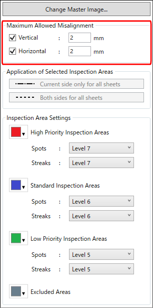 Ange inspektionsnivåer för [Spots] och [Streaks] för varje inspektionsområde