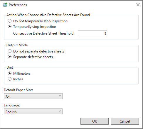[Temporarily stop inspection] | Перевірка зупиняється, якщо є кілька послідовних аркушів із дефектами. У полі [Consecutive Defective Sheet Threshold] введіть кількість аркушів із дефектами поспіль до зупинки. |