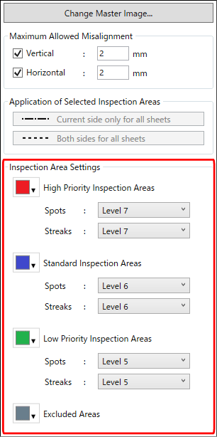 Налаштуйте рівні перевірки для параметрів [Spots] і [Streaks] для кожної області перевірки.