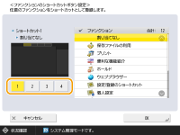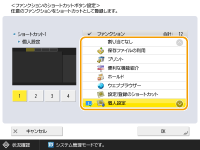 <ホーム>画面に表示されている機能のショートカットを作成することができます。他の機能を操作している途中でもショートカットが表示されていれば、<ホーム>画面に戻ることなく機能を呼び出すことができます。なお、ショートカットを作成するには、管理者としてログインする必要があります。
