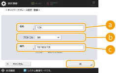 2 | 必要な情報を入力し、<OK>を押す ![]() <名称>接続先のWindowsサーバーまたはアドバンスドボックスの名前を入力します。ここで入力した名称は、アクセスするときに一覧表示されますので、分かりやすいものにしてください。 <プロトコル>接続先のWindowsサーバーまたはアドバンスドボックスがSMBサーバーとして公開されているか、もしくはWebDAVサーバーとして公開されているかに応じて、<SMB>または<WebDAV>を選びます。 <場所>/<ホスト名>プロトコルで<SMB>を選ぶと<場所>が、<WebDAV>を選ぶと<ホスト名>が表示されます。 <場所>は、共有スペースに接続する場合は「\\ホスト名またはIPアドレス\share」、個人スペースに接続する場合は「\\ホスト名またはIPアドレス\users」と入力します。 <ホスト名>は、「http(s)://ホスト名またはIPアドレス」と入力し、<次へ>を押します。続けて<フォルダーのパス>を押し、共有スペースに接続する場合は「/share」、個人スペースに接続する場合は「/users」と入力します。 ![]() 動作不良の原因となる可能性がありますので、公開されている他のimageRUNNER ADVANCEシリーズのアドバンスドボックスやWindowsサーバー以外は登録しないでください。 |