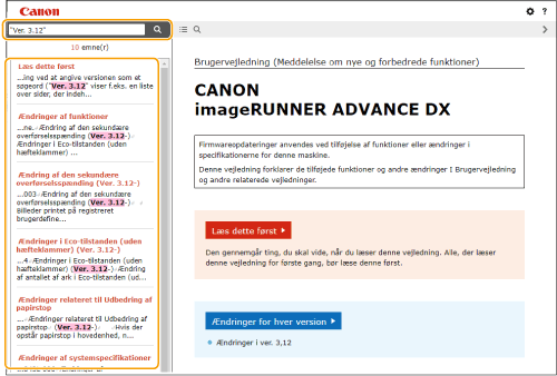 Søg med søgeordSøgning ved at angive versionen som et søgeord ("Ver. 3.12" viser f.eks. en liste over sider, der indeholder dette søgeord. Derefter kan du søge på de angivne sider.