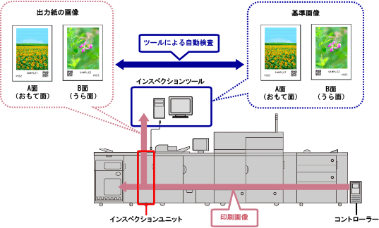 検査や照合に必要なユニットやソフトウェア(インスペクションツール)と、印刷に必要なプリンターやコントローラーなどを組み合わせたシステム全体を、インスペクションシステムと呼びます。