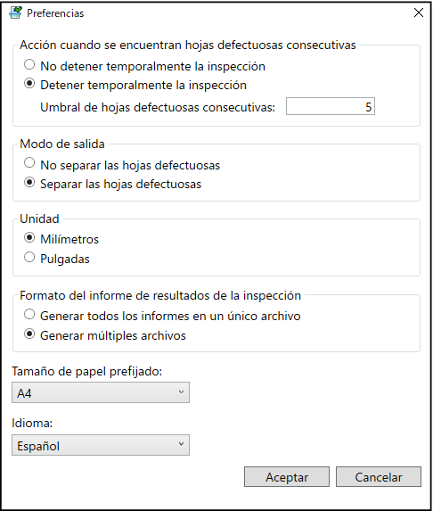 [No detener temporalmente la inspección] | Continúa la inspección sin detenerse incluso si existen múltiples hojas defectuosas consecutivas. |