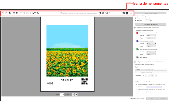 En la pantalla se muestran herramientas para crear y editar áreas de inspección. Consulte lo siguiente para obtener una información detallada. |