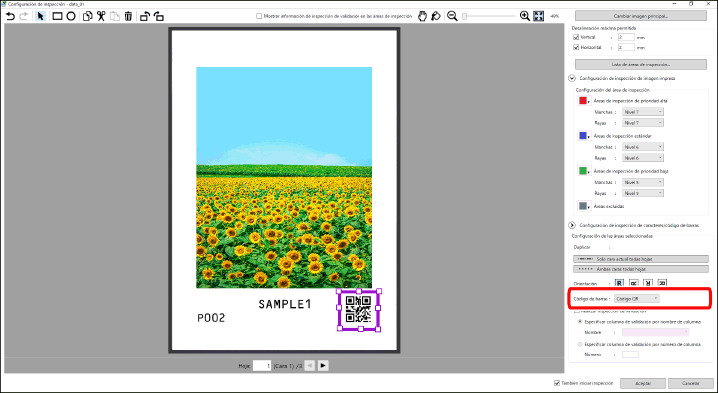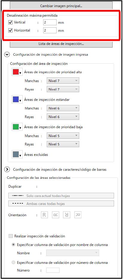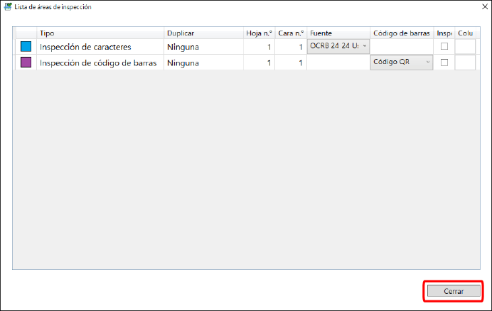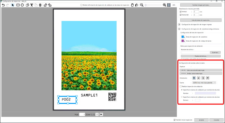 Seleccione las áreas de inspección de texto y códigos de barras y configure [Configuración de las áreas seleccionadas] para cada área