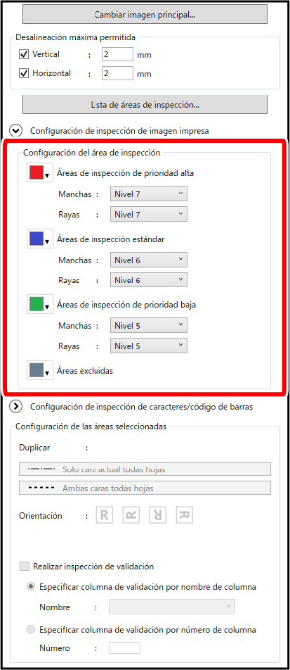 Seleccione las áreas de inspección de imágenes y configure los niveles de inspección de [Manchas] y [Rayas] para cada área en [Configuración del área de inspección] de [Configuración de inspección de imagen impresa]