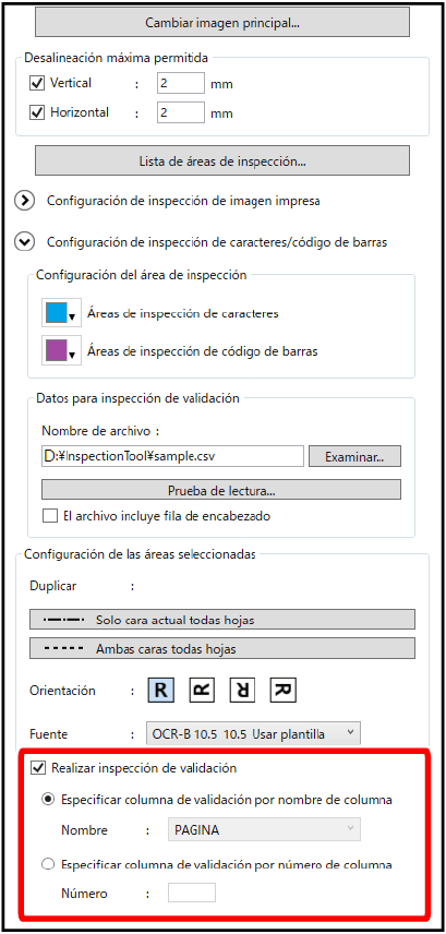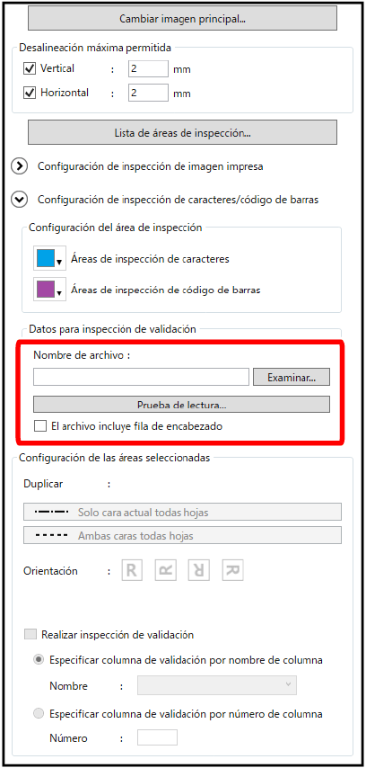 1. Haga clic en el botón [Examinar] en [Datos para inspección de validación] de [Configuración de inspección de caracteres/código de barras] y especifique un archivo CSV que contenga las cadenas correctas.