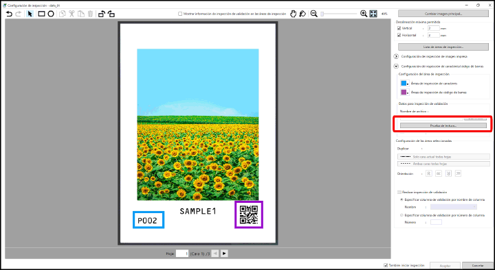 1. Haga clic en el botón [Prueba de lectura] en [Datos para inspección de validación] de [Configuración de inspección de caracteres/código de barras].