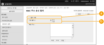 MAC 주소를 잘못 입력한 경우 리모트 UI에서 기기에 액세스하지 못할 수 있습니다. 이러한 경우 조작 패널에서 <MAC 주소 필터>에 있는 <송신 필터>/<수신 필터>에 대해 <필터 사용>을 <해제>로 설정합니다.
