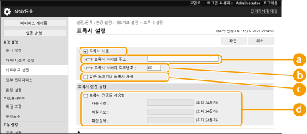 [프록시 인증을 사용함]프록시 서버의 인증 기능을 사용하려면 이 확인란을 선택하고 [사용자명]에 인증용 사용자 이름을 입력한 후 영숫자 문자를 사용하여 [비밀번호]에 설정할 새 비밀번호를 입력합니다.