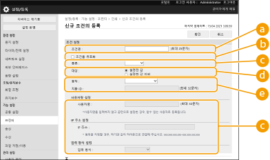 [대상]작업 대상에 의해 지정된 값 또는 지정되지 않은 값을 설정할 수 있습니다. [동작]조건과 일치하는 문서를 처리하는 방법을 선택합니다. [공유 작업으로 홀드]를 선택하면 [치환 ID]를 설정하여 인쇄 시에 로그로 출력할 사용자 이름을 지정할 수 있습니다. 문서를 폐기하려면 [취소]를 선택하십시오. | ||||||