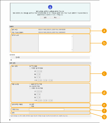 [발표 일정]펌웨어를 즉시 다운로드하려면 [즉시 발표]를 선택하십시오. 지정한 날짜와 시간에 펌웨어를 자동으로 다운로드하려면 [지정한 일시에 발표]를 선택하고 [년:]/[월:]/[일:]/[시각:]에 날짜와 시간을 지정하십시오. 일주일 이내 범위에서 시간을 먼저 예약할 수 있습니다.
