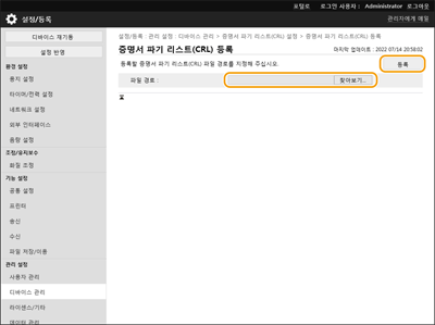리모트 UI를 사용하여 인증서 해지 목록(CRL)을 등록할 수 있습니다. 기기에 등록 가능한 CRL에 대한 자세한 내용은