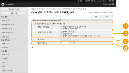 통신 중 상대방으로부터 수신한 인증서가 유효한지 여부를 확인하는 방법에는 두 가지가 있습니다. 기기에 등록된 인증서 해지 목록(CRL)과 비교하는 것과 OSCP(온라인 인증서 상태 프로토콜) 응답기(OCSP를 지원하는 서버)에 대해 문의하는 것입니다. 환경에 따라 인증서 만료를 확인하는 방법을 설정합니다. 관리자만 이 등록을 수행할 수 있습니다.
