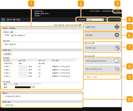 일부 표시 항목 및 기능은 관리자 권한으로 로그인한 경우에만 사용이 가능합니다. 여러 사용자가 리모트 UI를 동시에 작동하거나 기기의 조작 패널이 리모트 UI와 동시에 작동될 경우 수행된 마지막 작업이 유효합니다. |