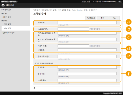 4 | 필수 정보를 입력합니다. ![]() [도메인명:]로그인 수신인인 Active Directory의 도메인 이름을 입력합니다(예: 회사.domain.com). [NetBIOS 이름]NetBIOS 도메인 이름을 입력합니다(예: 회사). [기본 호스트명 또는 IP 주소:] / [보조 호스트명 또는 IP 주소:]Active Directory 서버의 호스트 이름 또는 IPv4 주소를 입력합니다. 보조 서버를 사용할 때는 [보조 호스트명 또는 IP 주소:]에 이름을 지정합니다. 예: 호스트 이름 사용: ad-server1 IPv4 주소 사용: 192.168.18.138 [사용자 이름:] / [비밀번호:]Active Directory 액세스 및 검색에 사용할 사용자 이름과 비밀번호를 입력합니다. [검색 시작 지점:]Active Directory Server에서 액세스하고 검색할 위치를 지정합니다. [로그인명:] / [표시 이름] / [이메일 주소:]Active Directory 서버에 있는 각 사용자 계정의 로그인 이름, 표시 이름, 이메일 주소에 대한 데이터 필드(속성 이름)를 지정합니다(예: sAMAccountName, cn, mail). |