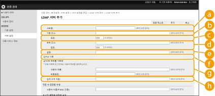 3 | LDAP 서버 정보를 입력합니다. ![]() [서버명]LDAP 서버의 이름을 입력합니다. "localhost"는 이름으로 사용할 수 없습니다. 이름에는 공백이 들어갈 수 없습니다. [기본 주소]LDAP 서버의 IP 주소 또는 호스트 이름을 입력합니다(예: ldap.example.com). 루프백 주소(127.0.0.1)는 사용할 수 없습니다. [포트:]LDAP 서버와의 통신에 사용할 포트 번호를 입력합니다. 서버에 구성된 설정과 동일한 설정을 사용하십시오. 번호를 입력하지 않으면, [TLS 사용] 확인란이 선택된 경우에 "636"으로 자동 설정됩니다. 확인란이 선택되어 있지 않으면 "389"로 자동 설정됩니다. [보조 주소:] / [포트:]보조 서버를 사용하는 경우, IP 주소 및 포트 번호를 입력합니다. [설명]필요 시 설명 또는 메모를 입력합니다. [TLS 사용]LDAP 서버와의 통신에 TLS 암호화를 사용하는 경우 확인란을 선택하십시오. [인증 정보를 사용함]LDAP 서버가 익명 액세스를 허용하도록 설정된 경우에만, 확인란을 해제하여 익명 액세스를 허용합니다. 사용자 이름과 비밀번호를 인증에 사용할 경우, 확인란을 선택하고 [사용자 이름:] 및 [비밀번호:]에 대한 값을 입력합니다. ![]() 이 확인란을 선택할 경우 LDAP 서버의 [기본 주소] 또는 [보조 주소:]에서 설정을 변경하려면 [인증 정보를 사용함]에서 [비밀번호:]에 지정된 비밀번호를 입력해야 합니다. [검색 시작 지점:]LDAP 서버 인증이 실행될 때 사용자 정보를 검색할 위치(레벨)를 지정합니다. |