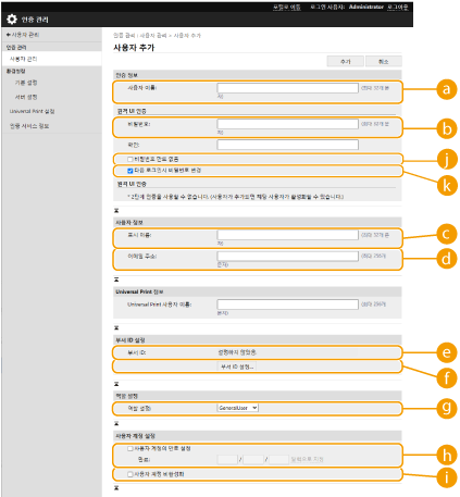 uid | 예 | 1 ~ 32문자 | 제어 문자, 1바이트 공백, 다음 문자: \ / : * ? | < > [ ] ; , = + @ " | ![]() | 가져올 때 반드시 입력해야 합니다. 설정에 따라 "@"를 사용할 수 있습니다. 사용자 로그인 방법 및 인증 장치 구성하기 |