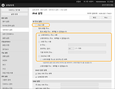 확인란을 선택하여 기기에서 IPv6을 활성화합니다. IPv6을 사용하지 않는 경우 확인란 선택을 취소합니다.
