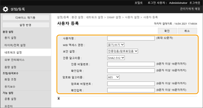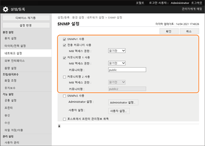 SNMP(Simple Network Management Protocol)는 MIB(Management Information Base)를 사용하여 네트워크에서 통신 디바이스를 모니터링하고 제어하는 프로토콜입니다. 기기는 SNMPv1과 보안 강화 SNMPv3를 지원합니다. 문서를 인쇄하거나 리모트 UI를 사용할 때 컴퓨터에서 기기 상태를 확인할 수 있습니다. SNMPv1 또는 SNMPv3를 활성화하거나 동시에 둘 다 활성화할 수 있습니다. 네트워크 환경과 사용 목적에 알맞게 각 버전의 설정을 지정합니다.