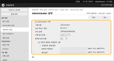 1 | [Administrator 설정]을 클릭합니다. [Administrator 사용] 관리자 사용자를 사용하려면 확인란을 선택합니다. [인증 알고리즘] 및 [암호화 알고리즘]은 변경할 수 없습니다. [인증과 동일한 비밀번호 사용] 사용자 인증에 사용한 비밀번호와 동일한 비밀번호를 사용하려면 확인란을 선택합니다. |