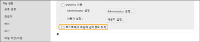 SNMP를 통해 기기의 프린터 관리 정보 모니터링을 활성화하려면 확인란을 선택합니다. 프린터 관리 정보 모니터링을 활성화하려면 확인란 선택을 취소합니다.