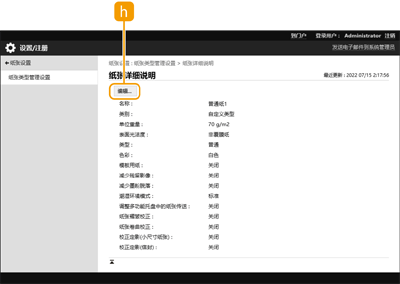 [编辑]出现在自定义纸张类型的[纸张详细说明] 屏幕上,并可以更改所选项目的设置。