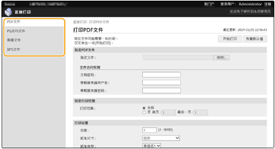 如果PDF文件设置了密码,请按[指定PDF文件]在[文档密码]中输入密码。打印链接到策略服务器的PDF文件时,选择[指定PDF文件] 在[策略服务器用户名]中输入策略服务器用户名,并在[策略服务器密码]中输入策略服务器密码。
