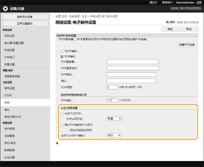 设置POP服务器的加密方法。选择[APOP]加密进行认证时的密码,或选择[POP认证]通过电子邮件接收(POP)进行用户认证。