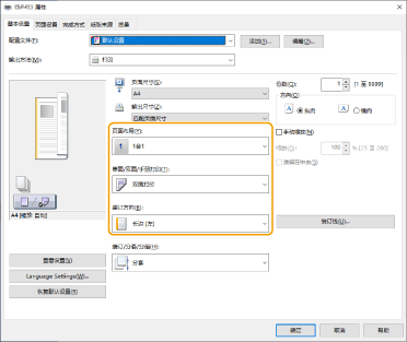 3 | 检查打印预览时,设置[页面布局] [页面顺序] [单面/双面/手册打印] [装订方向]。 |