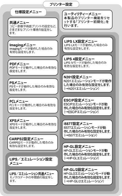 各動作モード(LIPS LX、LIPS IV、N201、ESC/P、I5577、HP-GL、HP-GL/2)の設定をします。LIPS、N201、ESC/P、I5577、HP-GL、HP-GL/2の各モードに共通の「LIPS/エミュレーション共通メニュー」と専用の「LIPS LX設定メニュー」、「LIPS4設定メニュー」、「N201設定メニュー」、「ESC/P設定メニュー」、「I5577設定メニュー」、「HP-GL設定メニュー」、「HP-GL/2設定メニュー」があります。