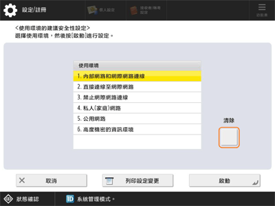 按 <管理設定> → <安全性設定> → <使用環境的建議安全性設定>。
