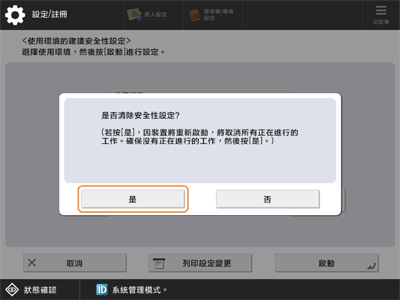 機器重新開機,建議的安全性設定取消,同時機器返回至其之前狀態。