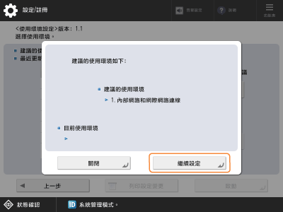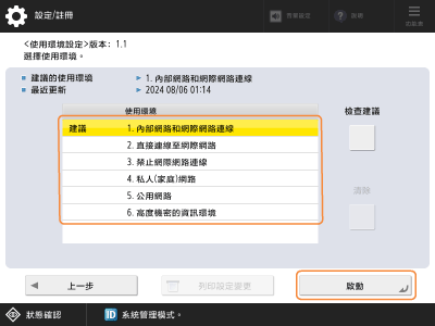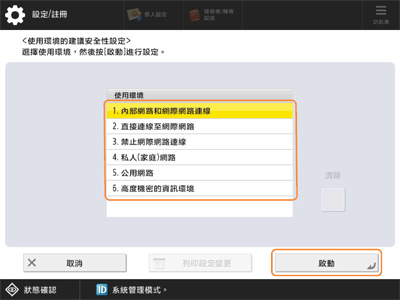 5如果已透過選擇建議的環境類型變更安全性設定,則顯示 <使用環境設定> 畫面。步驟
