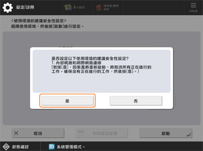 按 <管理設定> → <安全性設定> → <使用環境的建議安全性設定>。