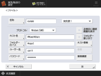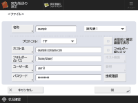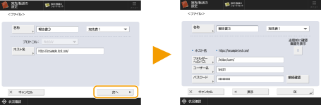 ![]() ファイルサーバーの情報は、ネットワーク管理者に確認してください。 <ホスト名>に入力できるのは、半角128文字(全角64文字)以内です。また、<フォルダーのパス>には半角255文字(全角127文字)以内です。それぞれ制限文字数以内になるように、サーバー側を設定してください。 <ホスト名>ファイルサーバーのホスト名を入力します ![]() <Windows (SMB)>選択時 <ホスト検索>と<参照>ボタンが表示されます。ネットワーク上を検索または参照して、簡単にファイルサーバー(ワークグループ)を指定することができます。 <参照>画面のドロップダウンリストから<Directory>を選択すると、本製品に登録したActive Directoryサーバーのドメイン名の中から選択することができます。Directoryサーバーは最大5件まで登録できます。サーバー情報を登録する <WebDAV>選択時 ホスト名入力後<次へ>を押してください。 <フォルダーのパス>データを送信するフォルダーの場所を指定します。 ![]() プロトコルで<Windows (SMB)>を選択したとき、<接続確認>で確認できるのは指定したフォルダーのパスの第一階層までです。 <ユーザー名>ファイルサーバーへのログインユーザー名を入力します。 <パスワード>ファイルサーバーへのログインパスワードを入力します。 <フォルダー振り分け><フォルダー振り分け>をONにすると、送信時に<フォルダーのパス>で指定したフォルダーの中に新しいフォルダーを作って、そのフォルダーに保存します。送信先のフォルダーの中に別のフォルダーを追加してからスキャンする <フォルダー振り分け>は<Windows (SMB)>または<FTP>を選択したときに表示されます。 | ||||||||||||