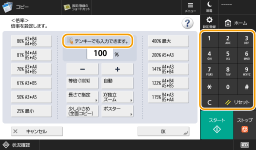 テンキーが表示されたときは画面に< テンキーでも入力できます。>と表示されたときは、テンキーを使って数値を入力することもできます。表示例:拡大/縮小コピーの設定画面 ![]() < テンキーで入力してください。>とメッセージが表示された場合は、テンキーでしか数値を入力できません。USBキーボードから文字を入力する本機のUSBポート(本体前面)に市販のUSBキーボードを接続して、文字を入力することができます。USBキーボードから入力する場合は、次の点にご注意ください。 <USB設定>の<USB入力デバイスにMEAPドライバーを使用>を<OFF>に設定しておく必要があります。<USB入力デバイスにMEAPドライバーを使用> USBキーボードでは、ASCIIコードのみ入力できます。 本機のキーボード画面に表示されていないキー(Delete、End、Tab、Esc、ファンクションなど)は使用できません。 USBキーボードの入力音は、音量調整の<入力音>と<入力無効音>の設定に従って動作します。音を設定する |