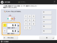 2 | <X>辺と<Y>辺の長さを設定する ![]() <X>または<Y>を押し、テンキーでそれぞれの辺の長さを入力します。 ![]() よく使う用紙サイズを<S1>~<S5>ボタンに登録しておけば、ワンタッチで呼び出すことができます。定形外サイズの用紙を登録する(ユーザー設定用紙) |