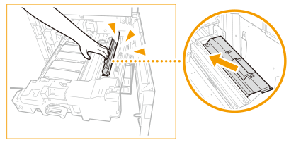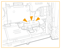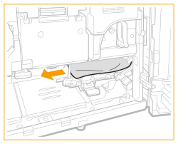 定着前搬送(右)(B)から紙を取り除いてください。用紙の上にのっているトナーが飛び散り、本体内部が汚れや画像不良の原因になる事があります。 |