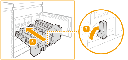 ![]() | C2レバーを持って、定着前搬送ユニットを押し込む ![]() 定着前搬送ユニットを押し込む際に、持っているC2レバーが跳ね上がるように動く場合がありますが故障ではありません。そのまま奥まで押し込んで次の手順に進んでください。 |