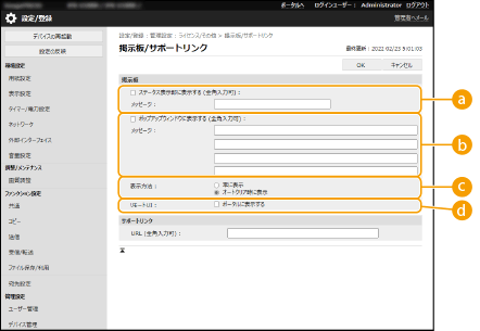 ユーザーへのお知らせをタッチパネルディスプレーに表示することができます。お知らせはタッチパネルディスプレーの最下部に表示したり、ポップアップ画面上に表示したりできますので、伝えたい内容やユーザーに応じて使い分けてください。ポップアップ画面上に表示するときは、リモートUIのポータルページに同じお知らせを表示させることもできます。設定にはAdministratorの権限が必要です。