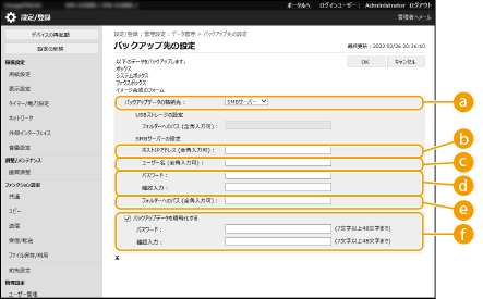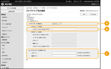 に続くパスを入力します。指定するフォルダーは、ユーザー制限が「2」以上または「無制限」に設定されている必要があります。ユーザー制限が「1」に設定されているフォルダーに保存データをバックアップすると、正しくリストアできません。