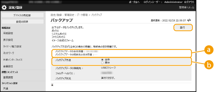 バックアップしたデータを変更したり削除したりしないでください。正常にリストアできなくなることがあります。 操作パネルやリモートUIを使って本機を操作しているときは、バックアップを実行しないでください。 |