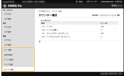 リモートUIから実行待ちのジョブの状況や、実行されたジョブの履歴を確認することができます。エラー情報や消耗品の残量など、本機の状態を確認することもできます。