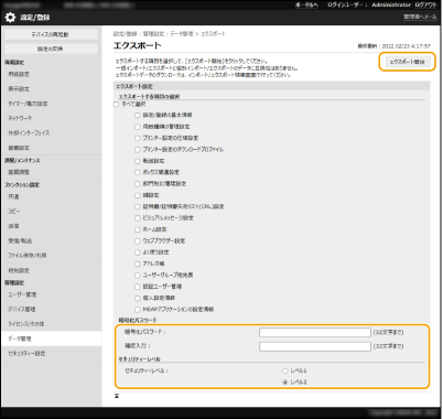 [セキュリティーレベル]に対応していない他の機種へ設定データをインポートする場合は、[レベル1]を指定してください。