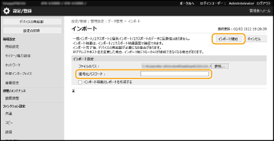部門別ID管理中の複合機に他機の部門別ID管理設定をインポートした場合、管理者情報も上書きされるため、今まで使っていた管理者IDと暗証番号ではログインできなくなる場合があります。操作の前に、他機に保存されている管理者情報を確認しておいてください。