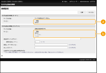 同期の通信ログを確認するカスタム設定の同期画面から、通信ログを確認することができます。ログはファイルとしてダウンロードすることもできます。 サーバー機が一時的に通信できない場合などはレベルに「Warning」が記録されます。 登録データの上限を超えている場合や、サーバー機との認証に失敗した場合にはレベルに「Error」が記録されます。 かんたんに同期設定をする同一ルーター内に存在するキヤノン複合機の場合は、カスタム設定の同期を操作パネルから開始することができます。 サーバー機の場合: (設定/登録) <管理設定> <デバイス管理> <カスタム設定の同期 (サーバー)>を<開始>クライアント機の場合: (設定/登録) <管理設定> <デバイス管理> <カスタム設定の同期 (クライアント)>を<開始>サーバー機兼クライアント機として動作させる場合はサーバー機の<カスタム設定の同期 (クライアント)>も<開始>にします。 認証方式として<User Authentication>が有効になっている必要があります。 同期を終了する場合のご注意クライアント機がカスタム設定の同期を終了した場合、サーバー機に登録されている各ユーザーの設定値を取得できなくなります。そのため、カスタム設定の同期を終了後にクライアント機であったデバイスのパーソナライズデータは最新の状態でない可能性がありますのでご注意ください。 |